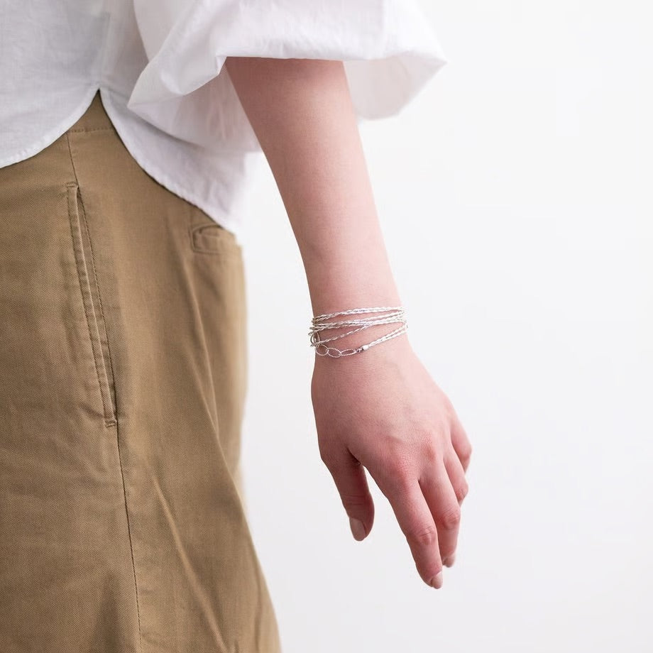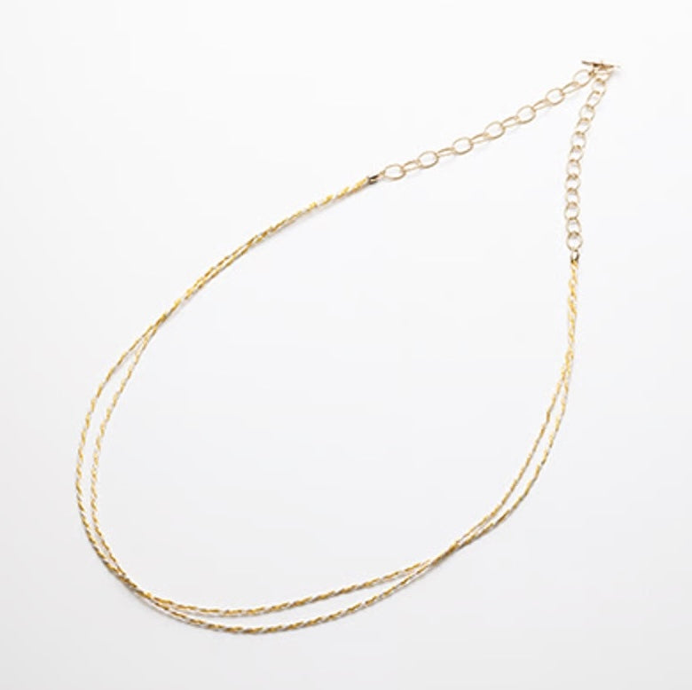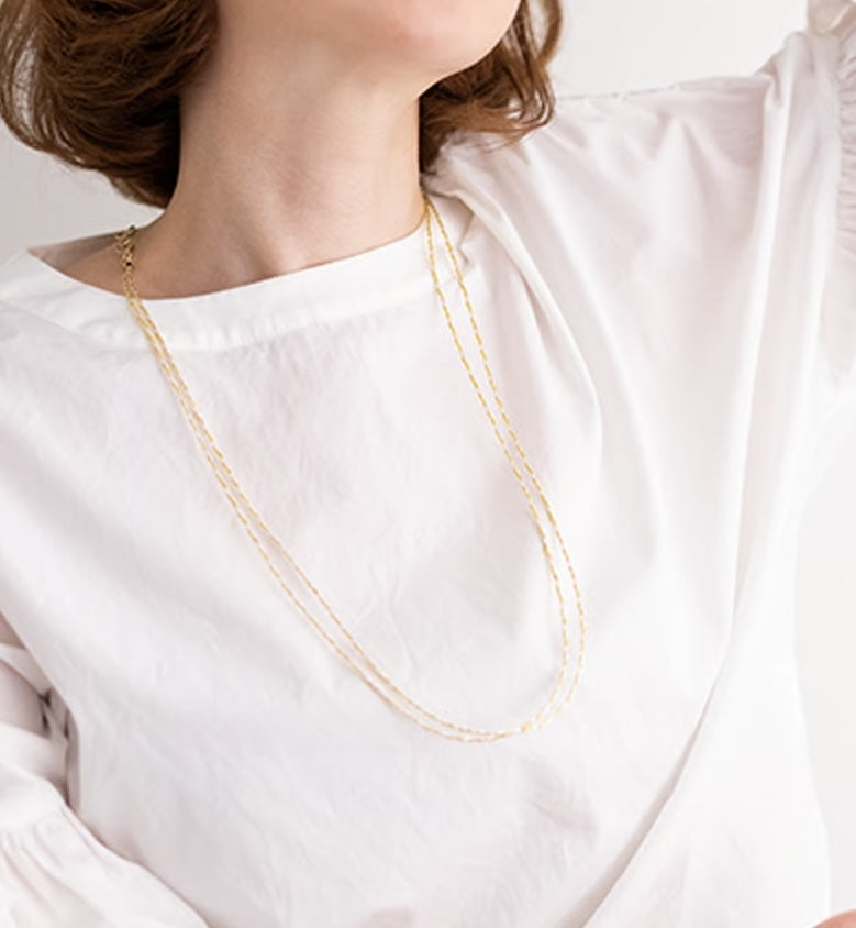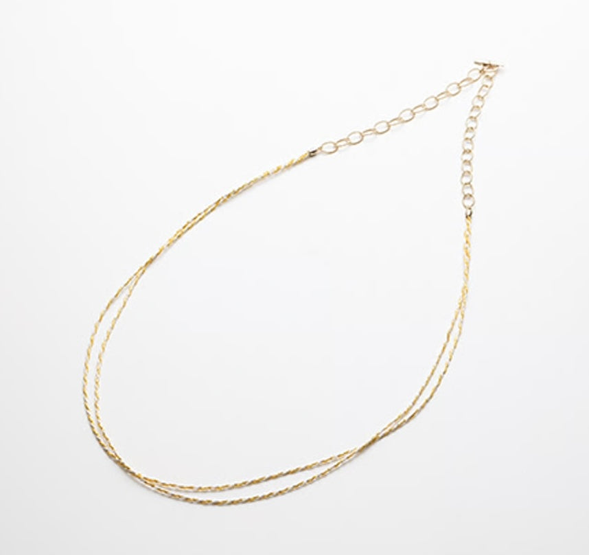 Preta is an accessory series crafted by twisting washi paper and finishing it with gold leaf, rhodium plating, or rayon for protection. It can be worn as a long necklace or wrapped multiple times as a bracelet, making it a versatile piece for many occasions.