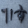 バスケットの蓋と本体を繋ぐハードウエアーのセットです。蓋に取り付けるラッチにはヒトデのデコレーションが付いています。ハスプは本体に編み込みます。ラッチをハスプにはめ、ハスプの穴にペグを挿して蓋と本体を留めます。ペグは巻貝の形、通常のペグのセットからお選び頂けます。セットに含まれるもの:ラッチ、ハスプ、ペグ